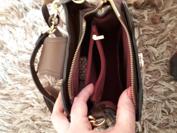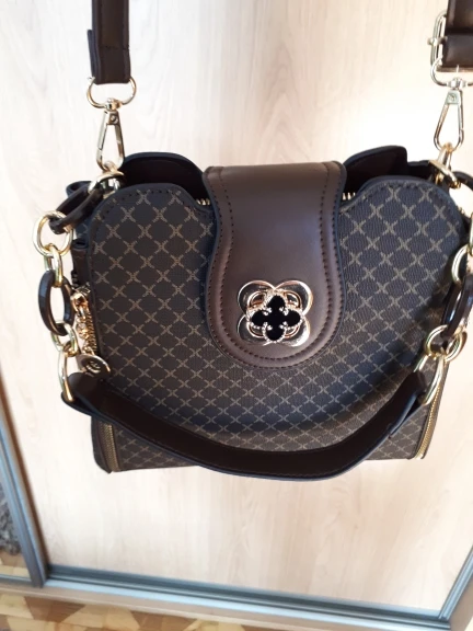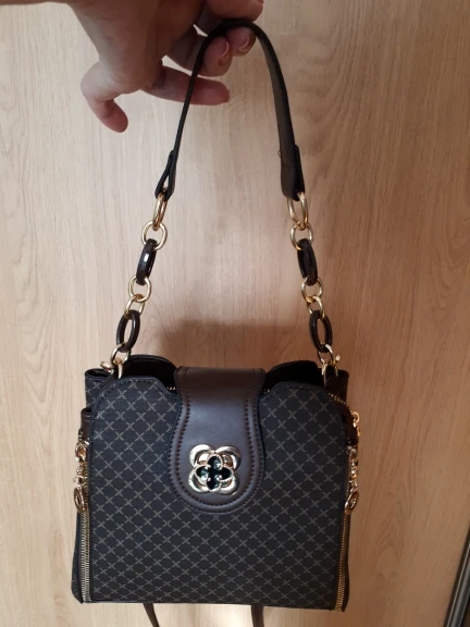 A very nice handbag, not too big, not too small. Two compartments and three pockets inside. Two straps, the shorter one with decorative chains. Interesting clasp, a rotating clasp. The quality is very good. I am satisfied with the purchase.
